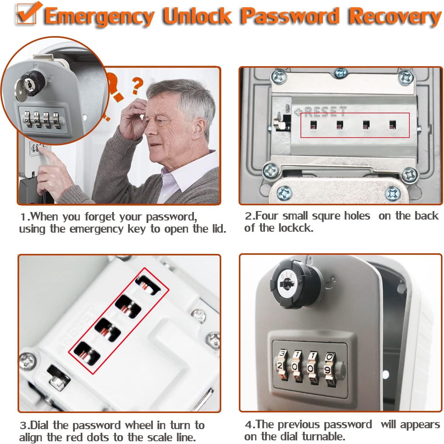 · Emergency Unlock og adgangskodegendannelsesdesign - Låsekassen kan åbnes med nødnøglen, når du glemmer den digitale PIN -kode. Password gendannelsesdesign Sørg for, at produktet ikke er et skrot, når du mister kombinationsnålen.